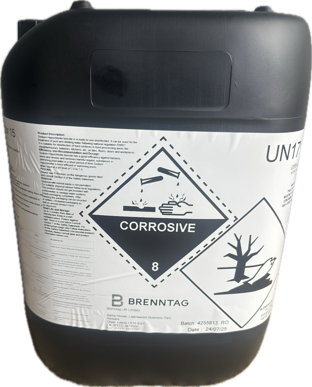 20lt Purechlor 15 sodium hypochlorite 14/15% (chlorus) is commonly used for cleaning swimming pools. milking parlours and patio cleaning.